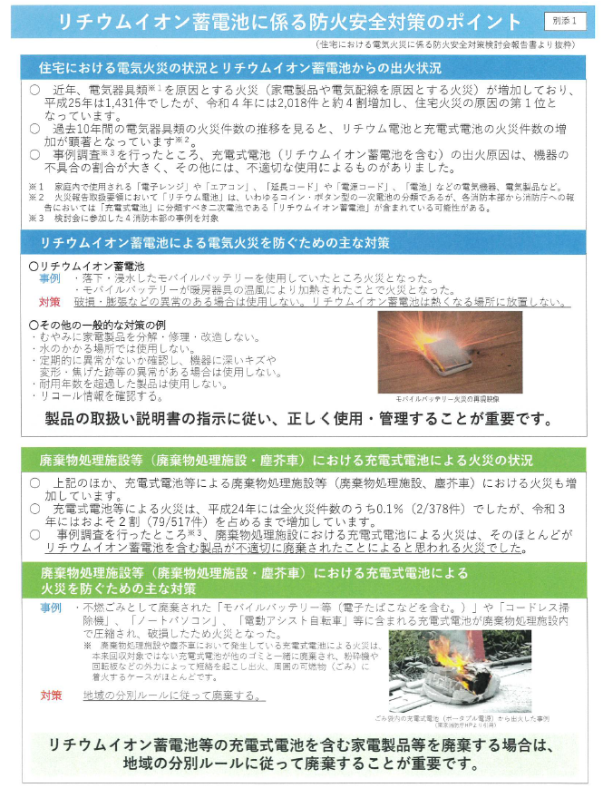 別紙1「リチウムイオン蓄電池に係る防火安全対策のポイント」